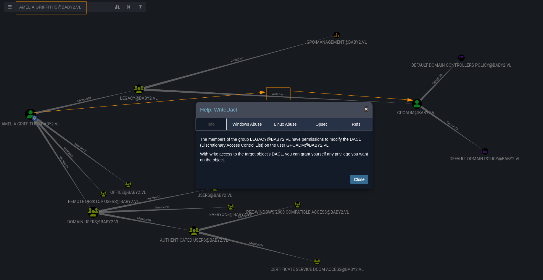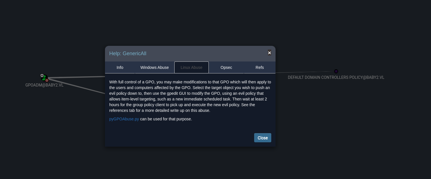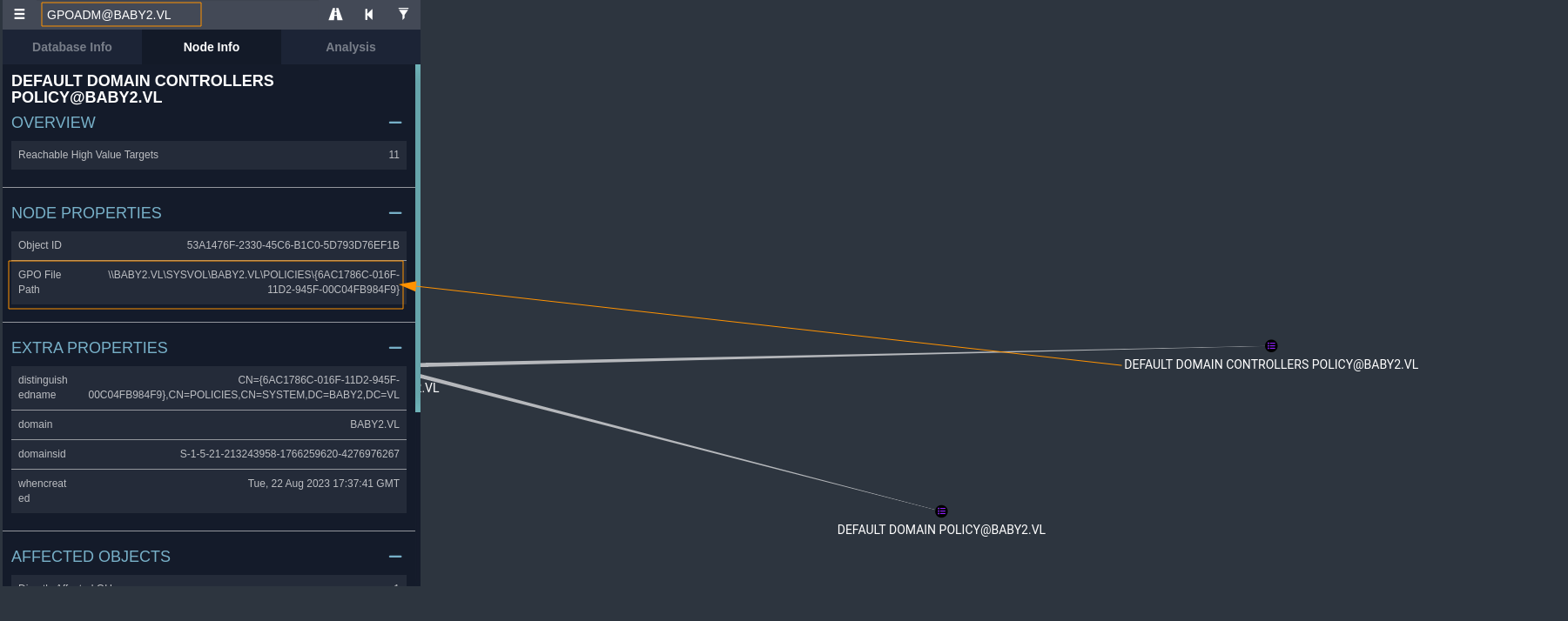 Back in BloodHound, we discovered that GPOADM@BABY2.VL