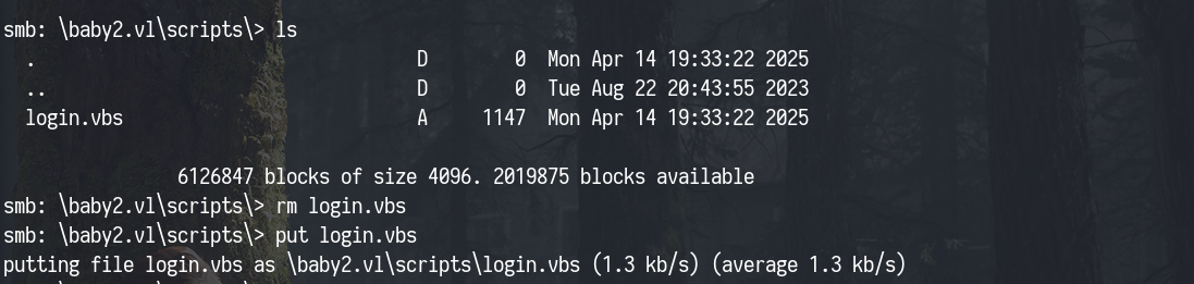 Before proceeding, we deleted the original login.vbs from the share to confirm write access. Once confirmed, we uploaded our modified version successfully.